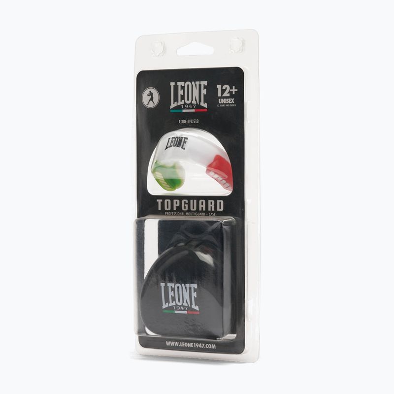 LEONE 1947 Top Guard daugiaspalvis žandikaulio apsaugos įtaisas sugerti smūgių jėgą treniruočių ir sparingo metu, efektyviai saugant sportininko dantis. Konstrukcijoje naudojama EVA putplastis, užtikrinantis aukštą energijos absorbcijos lygį.